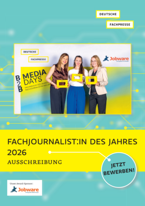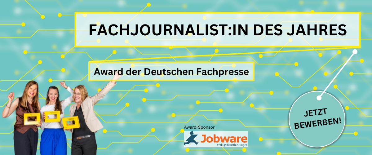 Fachjournalistinnen und Fachjournalisten leisten mit ihrem journalistischen Handwerkszeug, ihrem Fachwissen und ihrer Arbeit einen wichtigen Beitrag zum Erfolg von Fachmedien. Die Deutsche Fachpresse hebt diese Arbeit hervor und zeichnet deshalb auch 2025 wieder die besten Fachjournalist:innen mit dem Award "Fachjournalist:in des Jahres" aus. Die ersten drei Plätze sind jeweils mit 1.000 Euro dotiert.