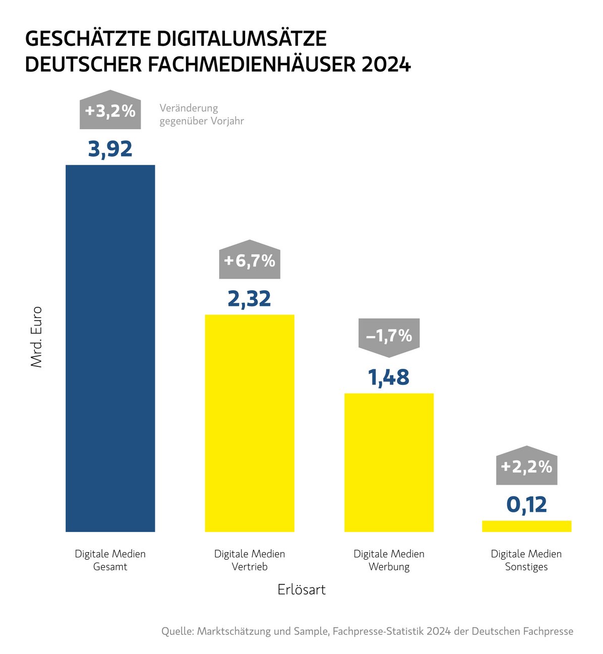 Der Digitalbereich erzielte 2024 einen Umsatz von 3,93 Milliarden Euro und bleibt mit einem Anteil von 46 Prozent am Gesamtumsatz der wichtigste Erlösbereich für die Fachmedienhäuser. Der Bereich wuchs gegenüber dem Vorjahr um 3,2 Prozent, was einem absoluten Zuwachs von 122 Millionen Euro entspricht. Noch stärker als im Vorjahr tragen die Vertriebserlöse das Wachstum des Digitalgeschäfts (digitale Fachzeitschriften und Fachbücher, Webseiten, Datenbanken, Workflow- und Softwarelösungen), die auf 2,32 Milliarden Euro stiegen (+ 6,7%, +145 Millionen Euro).