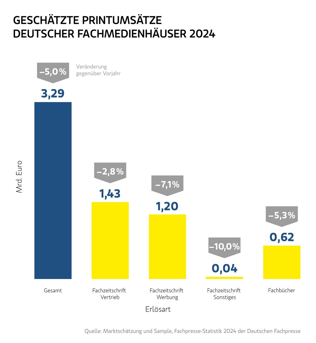 Die Anzahl der aufgelegten Print-Fachzeitschriftentitel sank um 62 auf 5.551 Titel (–1,1 %), die Gesamtauflage ging um 0,8 Prozent auf 539,9 Millionen Exemplare zurück. Die Erlöse pro Titel gingen mit –3,8 Prozent weniger stark zurück als die Gesamterlöse aus Fachzeitschriften (–4,9 %) – das Ergebnis einer gezielten Ausrichtung auf wirtschaftlich tragfähige Titel.