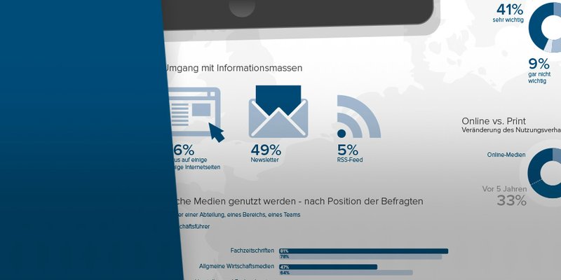 An der Studie, die in Zusammenarbeit mit der Unternehmer-Hochschule BiTS entstanden ist, haben mehr als 1000 Führungskräfte aus kleinen und mittelständischen sowie aus Großunternehmen teilgenommen. Ziel war, zu untersuchen, wie und wo Entscheider sich über ihr Arbeitsfeld informieren.