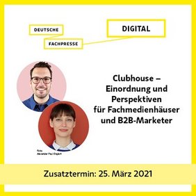 Die App Clubhouse ist in aller Munde und wird trotz limitierten Zugangs und offenen Datenschutzfragen intensiv genutzt. Im Online-Seminar "Clubhouse – Einordnung und Perspektiven für Fachmedienhäuser und B2B-Marketer" am 15. März (15 bis 16 Uhr) in Kooperation mit marconomy erklärt Stephan Hellwig die Funktionen der App und schätzt ihre heutige und zukünftige Relevanz für das B2B-Marketing ein. Mandy Schamber stellt Potenziale und Hürden aus Fachmedienperspektive vor. Im Anschluss an die beiden Kurzvorträge ist Zeit für Fragen. Dieses Online-Seminar ist ein Zusatztermin und inhaltlich gleich mit dem ausgebuchten Online-Seminar vom 3. März.