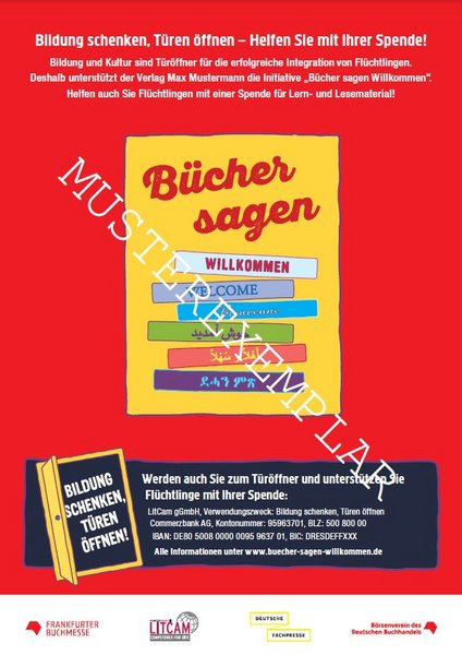 Im Rahmen der Initiative "<link http: www.litcam.de de projekte buecher-sagen-willkommen external link in new>Bücher sagen Willkommen" können Fachverlage nun auch mittels eines einheitlichen Anzeigenmotivs in den eigenen Publikationen für Spenden werben und damit ein vereintes Zeichen für die Integration von Flüchtlingen setzen. Mit der Initiative "Bücher sagen Willkommen" richtet die LitCam, eine von der Frankfurter Buchmesse gegründete gemeinnützige Gesellschaft, die sich für Bildungsgerechtigkeit und Integration einsetzt, Lese- und Lernecken in Flüchtlingsunterkünften ein und trägt so zu einer erfolgreichen Integration von Flüchtlingen bei.
