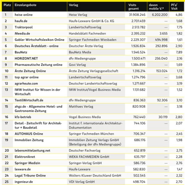 Die monatlich zusammengestellte Tabelle gibt einen Überblick über die Top 25-Onlineangebote deutscher Fachmedienverlage (nur Mitgliedsverlage). Voraussetzung für die Berücksichtigung der mobilen Visits im Ranking ist, dass diese bei der IVW gemeldet wurden.