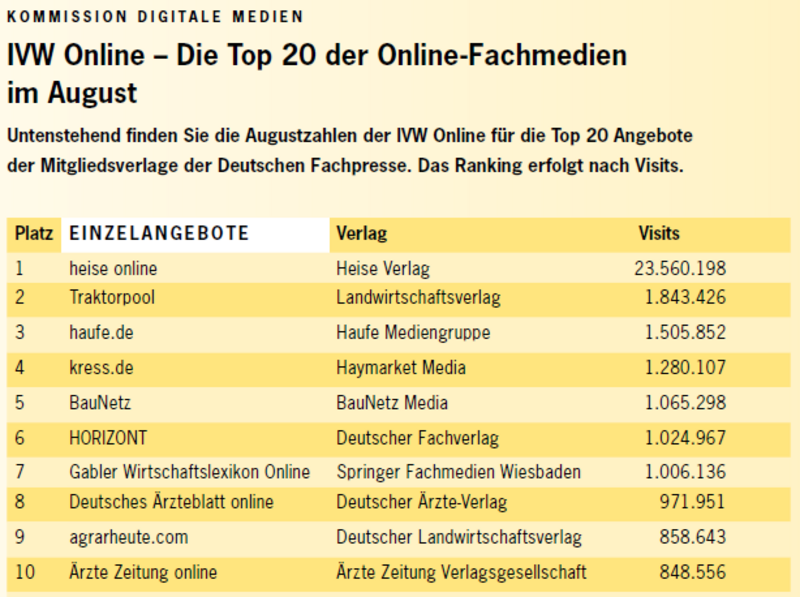 Nachdem sich die Nachfrage nach Online-Fachinformationen bereits im Juli als instabil zeigte, hat sie im August noch weitere Rückgänge zu verkraften. Leichte Zugewinne an Visits konnte die Plattform "Traktorpool" (Landwirtschaftsverlag) verzeichnen, die konstant auf Platz Zwei des Rankings bleibt. Ebenfalls aus dem Landwirtschaftsverlag verbesserte sich zudem mit einem Plus von mehr als 16.000 Visits (+2 Prozent) das Angebot "agrarheute.com" von Rang 11 auf Rang 9. Die Netzwerke aus deutschen Fachmedienhäusern weisen ebenfalls leichte rückgängige Zugriffszahlen auf. Deutlichere Zuwachse verbuchen hier nur "Springer Medizin" (+ 8 Prozent) und "Ferdinand Holzmann Verlag" (+ 10,5 Prozent). Die monatlich zusammengestellte Tabelle gibt einen Überblick über die Top 20-Onlineangebote deutscher Fachmedienverlage (nur Mitgliedsverlage). Weitere Informationen <link http: www.deutsche-fachpresse.de ivw_online external-link-new-window external link in new>hier.