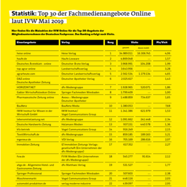 Die monatlich zusammengestellte Tabelle gibt einen Überblick über die Top 30-Onlineangebote deutscher Fachmedienunternehmen (nur Mitgliedsunternehmen). IVW Online: Aktuelle Zahlen und Archiv