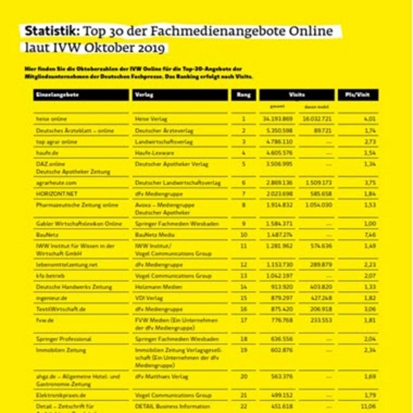 Die Online-Angebote der Fachpresse-Mitglieder erreichten im Vergleich zum Vorjahresmonat Oktober erneut mehr Visits. Aufgrund der großen Visitsteigerung bei top agrar online ergibt sich eine neue Zusammensetzung der Top 3: Nummer 1 bleibt heise online mit 34.193.869 Gesamtbesuchen, gefolgt von Deutsches Ärzteblatt – online (5.350.598 Visits insgesamt) mit einem prozentualen Zuwachs von 73 Prozent und top agrar online (4.786.110 Visits insgesamt) mit einer Steigerung von 82 Prozent bei den Visits. argarheute.com steigert seine mobilen Visits um beachtliche 191 Prozent von 518.125 auf 1.506.173 und bleibt wie im Oktober 2018 auf Platz 6. Pharmazeutische Zeitung online verzeichnet sowohl insgesamt (von 919.212 auf 1.914.832 Visits) als auch bei den mobilen Klickzahlen (von 713.567 auf 1.054.030 Visits) enorme Steigerungen und klettert von Rang 12 auf 8. Auffallend hoch bleiben die Page Impressionss pro Visit der Online-Angebote rund ums Thema Architektur und Bauen: mit 11,06 Pis konnte Detail – Zeitschrift für Architektur und Baudetail ihre Klickzahlen pro Zugriff weiter steigern.