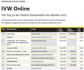 Die monatlich zusammengestellte Tabelle gibt einen Überblick über die Top 30-Onlineangebote deutscher Fachmedienverlage (nur Mitgliedsverlage).