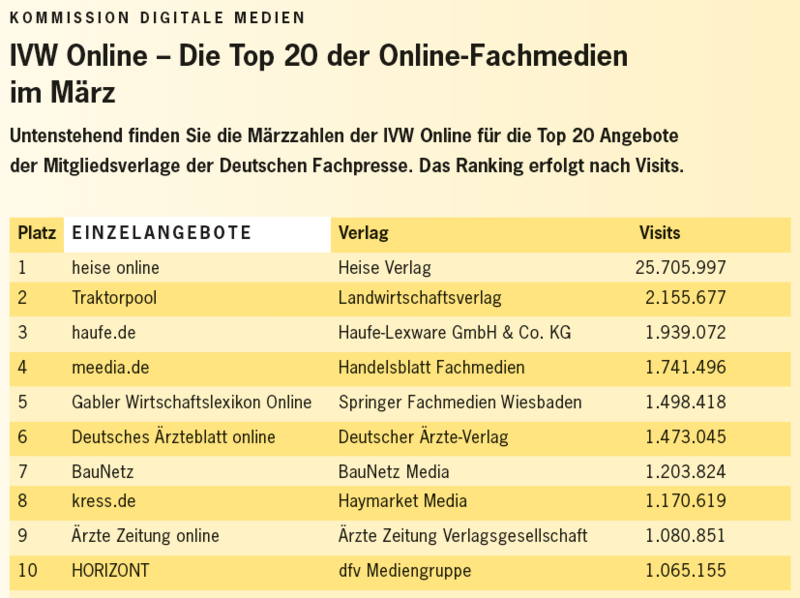 Die monatlich zusammengestellte Tabelle gibt einen Überblick über die Top 20-Onlineangebote deutscher Fachmedienverlage (nur Mitgliedsverlage). Die vollständige Tabelle kann <link http: www.deutsche-fachpresse.de ivw_online external-link-new-window external link in new>hier eingesehen werden.