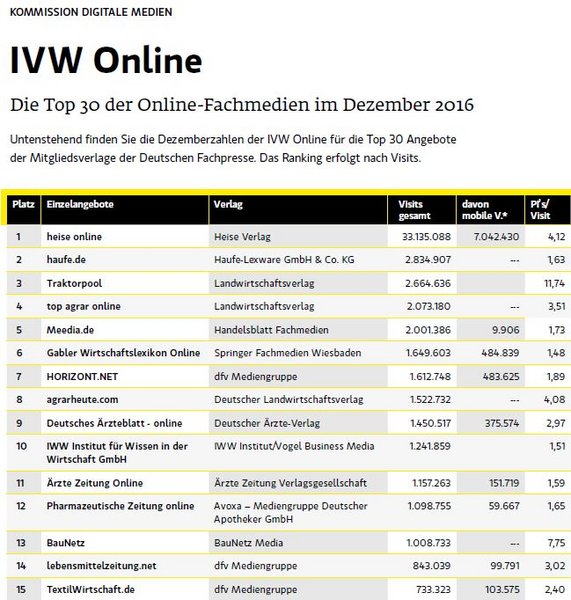 Die monatlich zusammengestellte Tabelle gibt einen Überblick über die Top 30-Onlineangebote deutscher Fachmedienverlage (nur Mitgliedsverlage).