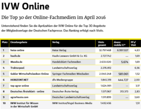 Im Monat April ist bei fast allen Top 30-Onlinenangeboten aus den deutschen Fachmedienhäusern ein leichter Zuwachs der Visits im Vergleich zum Vorjahr zu verzeichnen. Eindeutiger Gewinner im Vergleich zum Vorjahr ist die Legal Tribune Online (Wolters Kluwer Deutschland) mit einem Zuwachs von knapp 314.300 (+70 Prozent) und einer Verbesserung von 10 Plätzen auf Rang 15. Auch IWW Institut für Wissen in der Wirtschaft (IWW Institut/Vogel Business Media) klettert mit rund 434.000 (+41 Prozent) zusätzlichen Visits von Platz 13 auf Platz 10. Um jeweils zwei Ränge nach oben steigen HORIZONT.NET (dfv Mediengruppe) mit 462.000 zusätzlichen Visits (+33 Prozent) auf Platz 6 und Meedia.de (Handelsblatt Fachmedien) mit 701.000 weiteren Visits (+ 36 Prozent) auf Rang 3. Die monatlich zusammengestellte Tabelle gibt einen Überblick über die Top 30-Onlineangebote deutscher Fachmedienverlage (nur Mitgliedsverlage).