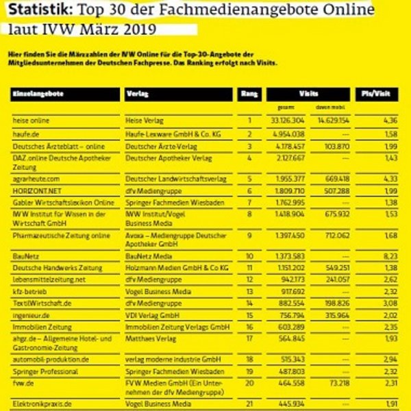 Die monatlich zusammengestellte Tabelle gibt einen Überblick über die Top 30-Onlineangebote deutscher Fachmedienunternehmen (nur Mitgliedsunternehmen).