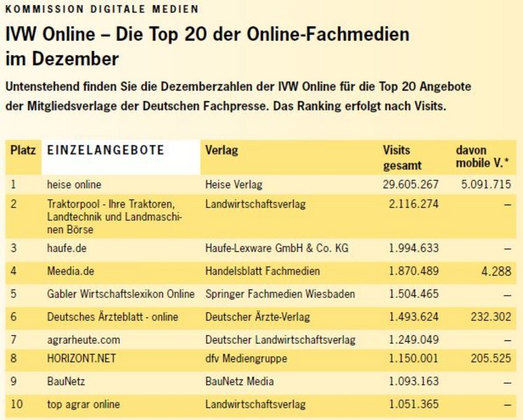 Die monatlich zusammengestellte Tabelle gibt einen Überblick über die Zahlen der IVW Online für die Top 20 Onlineangebote deutscher Fachmedienverlage (nur Mitgliedsverlage). Voraussetzung für die Berücksichtigung der mobilen Visits im Ranking ist, dass diese im Vorfeld bei der IVW gemeldet wurden. Die vollständige Tabelle finden Sie <link http: www.deutsche-fachpresse.de ivw_online external-link-new-window external link in new>hier.