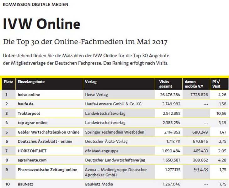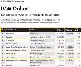 Viele Top-30-Onlineangebote aus den deutschen Fachmedienhäusern haben im Wonnemonate Mai einen Zuwachs an Visits zu verzeichnen. Neben haufe.de (Haufe-Lexware GmbH & Co.KG), die mit mehr als 1.155.000 (+45 Prozent)zusätzlichen Visits konstant den zweiten Platz verteidigen, hat sich die Deutsche Handwerks Zeitung (Holzmann Medien GmbH & Co. KG) mit mehr als 119.200 (+32 Prozent) zusätzlichen Visits vom Platz 30 im Vorjahr auf Platz 23 in diesem Jahr hochgearbeitet und ist damit der Gewinner des Monats Mai. Mit zusätzlichen rund 196.000 (30 Prozent) Visits hat sich die Legal Tribune Online (Wolters Kluwer Deutschland GmbH) von Platz 16 in 2016 auf Platz 12 in diesem Jahr verbessert. Auch das Deutsche Ärzteblatt Online (Deutscher Ärzte-Verlag) steigt mit rund 224.700 zusätzlichen Visits (+12 Prozent) 3 Plätze von 9 in 2016 auf 6 in diesem Jahr nach oben. Die monatlich zusammengestellte Tabelle gibt einen Überblick über die Top 30-Onlineangebote deutscher Fachmedienverlage (nur Mitgliedsverlage).