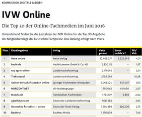 Gewinner im Vergleich zum Vorjahr sind IWW Institut für Wissen in der Wirtschaft GmbH (IWW Institut/Vogel Business Media) mit einem Zuwachs von mehr als 350.000 (+30 Prozent) zusätzlichen Visits sowie HORIZONT.NET (dfv Mediengruppe) mit mehr als 308.000 (+21 Prozent) zusätzlichen Visits. In diesem Monat haben es außerdem Maschinenmarkt (Vogel Business Media) und DAZ.online (Deutsche Apotheker Zeitung) unter die TOP 30 geschafft. Die monatlich zusammengestellte Tabelle gibt einen Überblick über die Top 30-Onlineangebote deutscher Fachmedienverlage (nur Mitgliedsverlage).