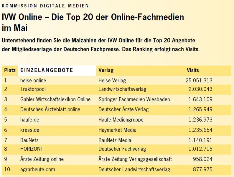 Im Mai weisen deutsche Fachmedienanbieter weiterhin stabile Nutzerzahlen bei ihren Onlineangeboten auf. Spitzenreiter bei den Einzelangeboten bleibt "heise online" (Heise Verlag) mit über 25 Millionen Visits. Platz zwei belegt die Plattform "Traktorpool" (Landwirtschaftsverlag), die sogar einen Zuwachs von über 200.000 zusätzlichen Besuchern aufweisen kann (+11 Prozent). Auch das "Gabler Wirtschaftslexikon Online" (Springer Fachmedien Wiesbaden) erringt im Vergleich zum Vormonat ein leichtes Plus mit knapp 50.000 zusätzlichen Visits (+3 Prozent). Neu in das Ranking eingestiegen sind auf den Plätzen 19 und 20 die "lebensmittelzeitung.net" (Deutscher Fachverlag) und "Springer Medizin" (Springer Verlag). Bei den Netzwerken aus deutschen Fachmedienhäusern bleibt die Reihenfolge konstant mit "Vogel Business Network" (Vogel Business Media), "Haufe Group Business Network" (Haufe Mediengruppe) und "HORIZONT.net" (Deutscher Fachverlag) an den führenden drei Positionen. Die monatlich zusammengestellte Tabelle gibt einen Überblick über die Top 20-Onlineangebote deutscher Fachmedienverlage (nur Mitgliedsverlage). Die vollständige Tabelle kann <link fileadmin allgemein bilder branchenwissen download file>hier eingesehen werden.