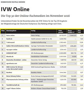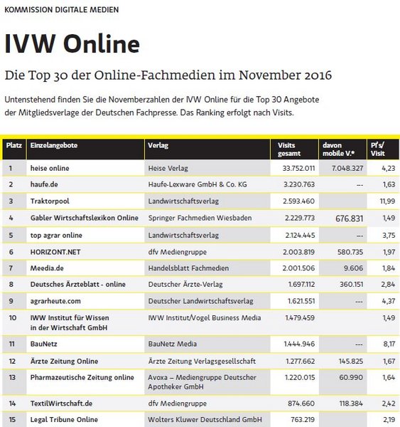 Die monatlich zusammengestellte Tabelle gibt einen Überblick über die Top 30-Onlineangebote deutscher Fachmedienverlage (nur Mitgliedsverlage).