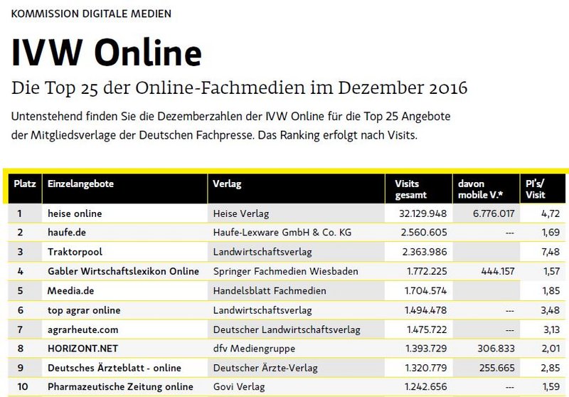Nach starken Zugriffszahlen in den Vormonaten, werden im Dezember die freien Tage spürbar: Bei den meisten deutschen Fachmedienhäuser ist insgesamt eine rückläufige Nachfrage ihrer Online-Angebote zu verzeichnen. Nicht so im Vergleich zum gleichen Monat des Vorjahres: Haufe.de hat sich mit 1.052.074 zusätzlichen Visits (+ 69,7 Prozent) zum Vorjahr den zweiten Platz erobert vor Traktorpool (Landwirtschaftsverlag) mit fast 296.000 zusätzlichen Visits (+ 14,3 Prozent). Besonders stark im Vergleich zum gleichen Monat des Vorjahrs haben sich agrarheute.com (Deutscher Landwirtschaftsverlag) mit 711.500 zusätzlichen Visits (+93 Prozent), top agrar online (Landwirtschaftsverlag) mit nahezu 704.000 zusätzlichen Visits (+89 Prozent) und Pharmazeutische Zeitung online (Govi Verlag) mit einem Zuwachs von 565.000 Visits (+83 Prozent) entwickelt.