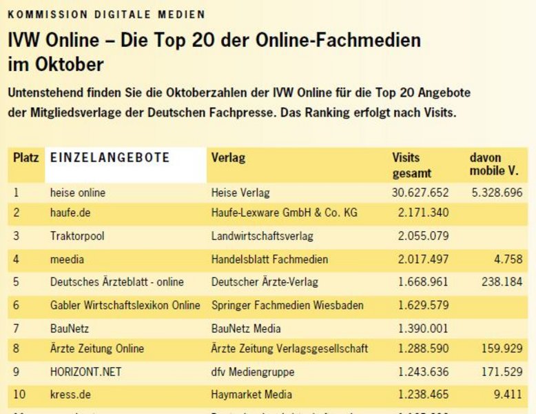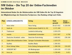 Ein Blick auf das Oktober-Ranking zeigt erfreuliche Zahlen. Die Plätze eins bis drei belegen "heise online" (Heise Verlag), "haufe.de" (Haufe-Lexware) und "Traktorpool" (Landwirtschaftsverlag). In diesem Monat neu im Ranking, schieben sich "Elektroniknet" (WEKA Fachmedien) und "Immobilien Zeitung" (IZ Immobilien Zeitung Verlagsgesellschaft) auf die Plätze 19 und 20. Die Reihenfolge bei den Netzwerken für Onlinefachinformationen bleibt gleich wie im Vormonat. Spitzenreiter "Vogel Business Network" (Vogel Business Media) überzeugt abermals mit zusätzlichen 235.000 Visits (+ 6 Prozent) und bleibt weiterhin Tabellenführer.