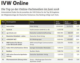 Die monatlich zusammengestellte Tabelle gibt einen Überblick über die Top 30-Onlineangebote deutscher Fachmedienverlage (nur Mitgliedsverlage).